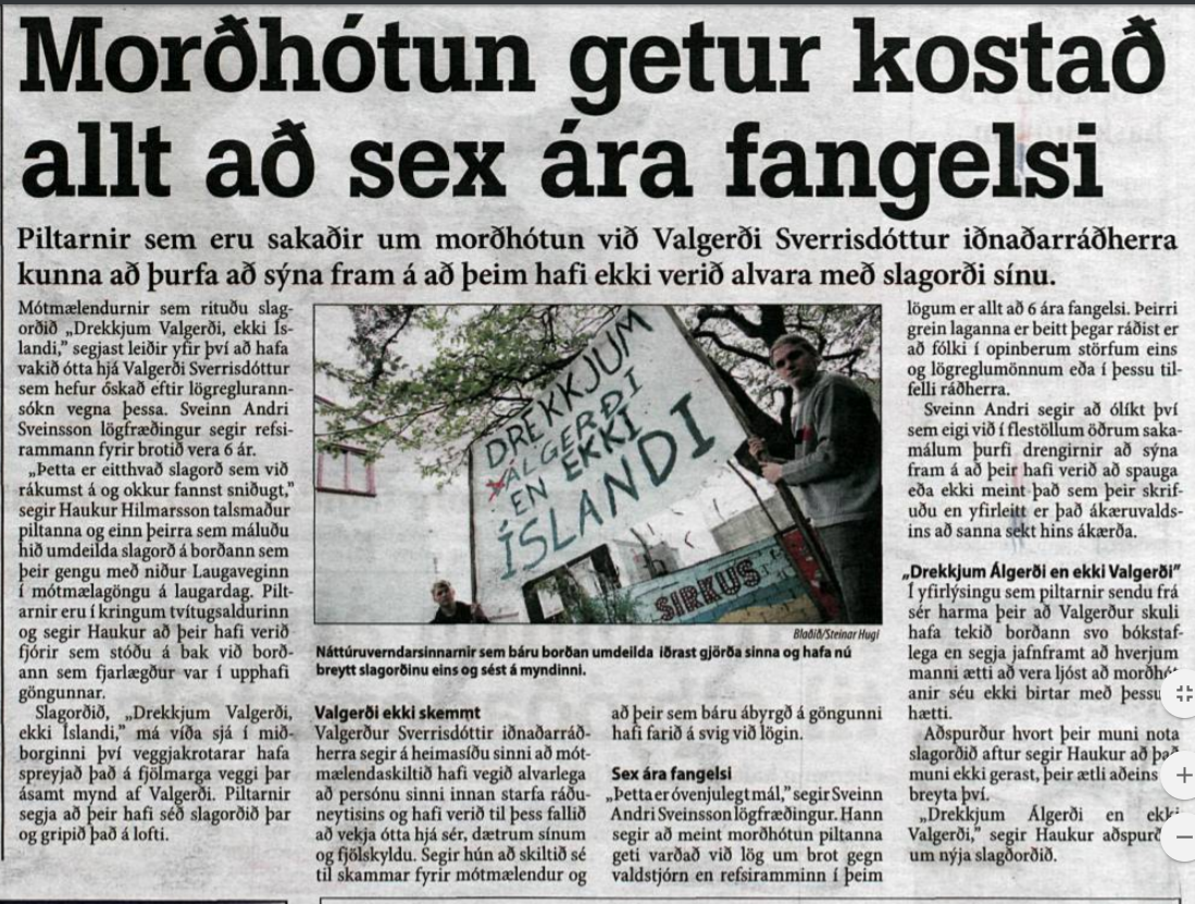 Líklega er þetta fyrsta aðgerðin aem Haukur tók þátt í sem olli fjaðrafoki og sennilega sú eina sem hann sjálfur leit síðar á sem ungæðishátt. Vitanlega var þetta ekki hugsað sem hótun heldur slagorð, sem beint var gegn ábyrgð ráðherra á eyðileggingu hálendisins. Hefðu þeir ætlað að ráða einhvern af dögum hefðu þeir væntanlega haft hljótt um það. Þeir félagar áttuðu sig á því fullseint að þeir hefðu átt að tala um „Álgerði“ frekar en Valgerði.