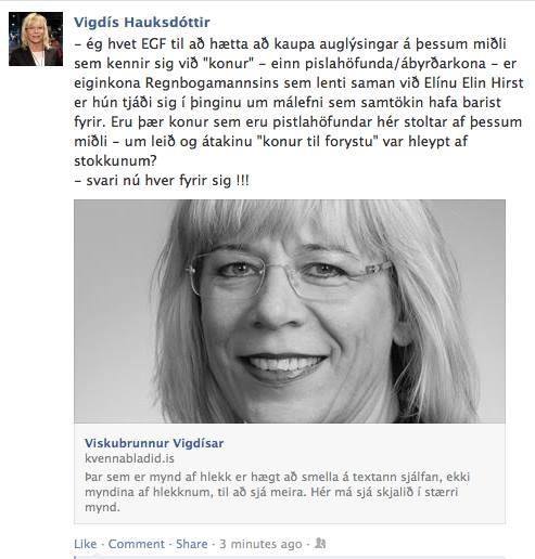 Í gær birti Kvennablaðið lýsiskjal af helstu gullkornum Vigdísar. Þingmaðurinn brást við þessu með því að pósta eftirfarandi brýningu á opnum vegg á samskiptamiðlinum Facebook: