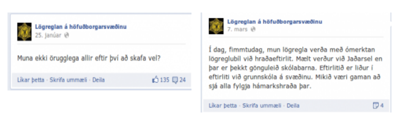 Ef fjöldi “læka” segir eitthvað um aðsókn er eðlilegra að skoða hversu mörg læk innleggin fá. Flestar færslur löggunnar fá minna en 200 læk. Ef við skoðum til samanburðar vinsælar netsíður á borð við Baggalút, sjáum við að lækin þar hlaupa oftast á mörgum hundruðum, jafnvel þúsundum. Ef samræmi er milli læka og lesturs nær Baggalútur til miklu fleira fólks en lögreglan. Auk þess deilir fólk fréttatenglum á facebook svo ef ætlunin er að koma skilaboðum til almennings eru fréttamiðlar miklu skilvikari leið en fb-síða lögreglunnar.